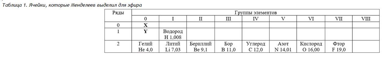Особенно детально пытался спрогнозировать свойства и параметры эфира русский ученый Д. И. Менделеев. Периодическая таблица химических элементов, которая помогла расставить по порядку все химические элементы и разделить их на группы с похожими свойствами — это его выстраданное детище, скрупулезно проверенное жизнью. Ему очень хотелось усовершенствовать свою таблицу, добавив в нее эфир. Вся его работа (Менделѣевъ, 1905) посвящена «реальнымъ стремленіемъ замкнуть реальную періодическую систему извѣстныхъ химическихъ элементовъ предѣлом или гранью низшаго размѣра атомовъ». Он даже определил место для эфира, обозначив новые спрогнозированные им элементы через x и y, поставив их впереди всей своей таблицы 1. Для наглядности показана не вся таблица Менделеева в его исполнении, а только начальные ряды, где вписаны новые элементы (x и y) и ближайшее их окружение.